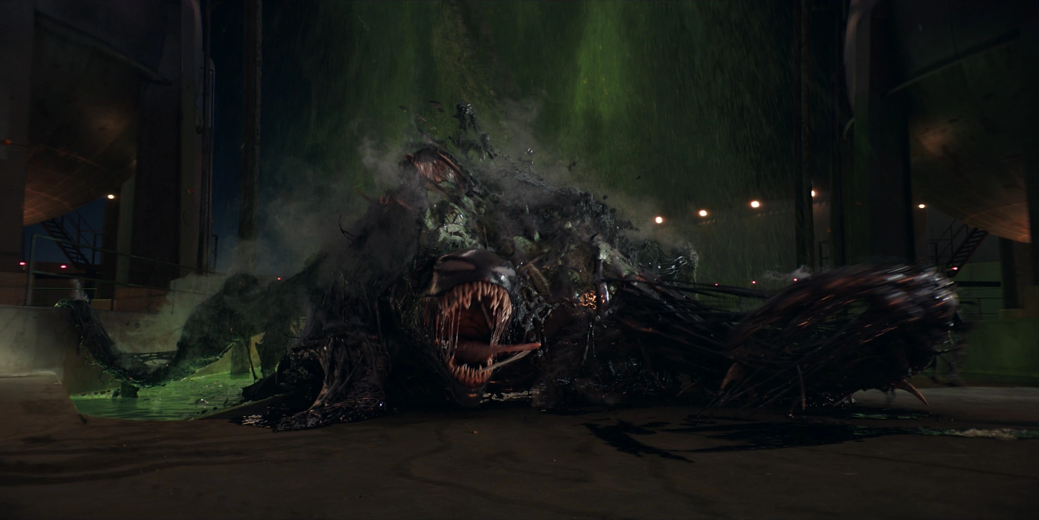 Shapeshifting: Venom can generate portions of itself out of Brock's body to form various constructs, including tendrils, shields, parachutes and various other appendages. It can also fully emerge from Brock while remaining attached to him, enveloping its host's body to form its own, complete with eyes, claws and a mouth with powerful jaws and sharp teeth, allowing it to tear flesh and eat off entire body parts from its victims. Its ability to manifest these constructs is fueled by how compatible it is with its host. The Symbiote notably uses tendrils for attack and defense, from grappling with Drake's guards, to pull Eddie back onto his motorcycle when he was flung through the air.