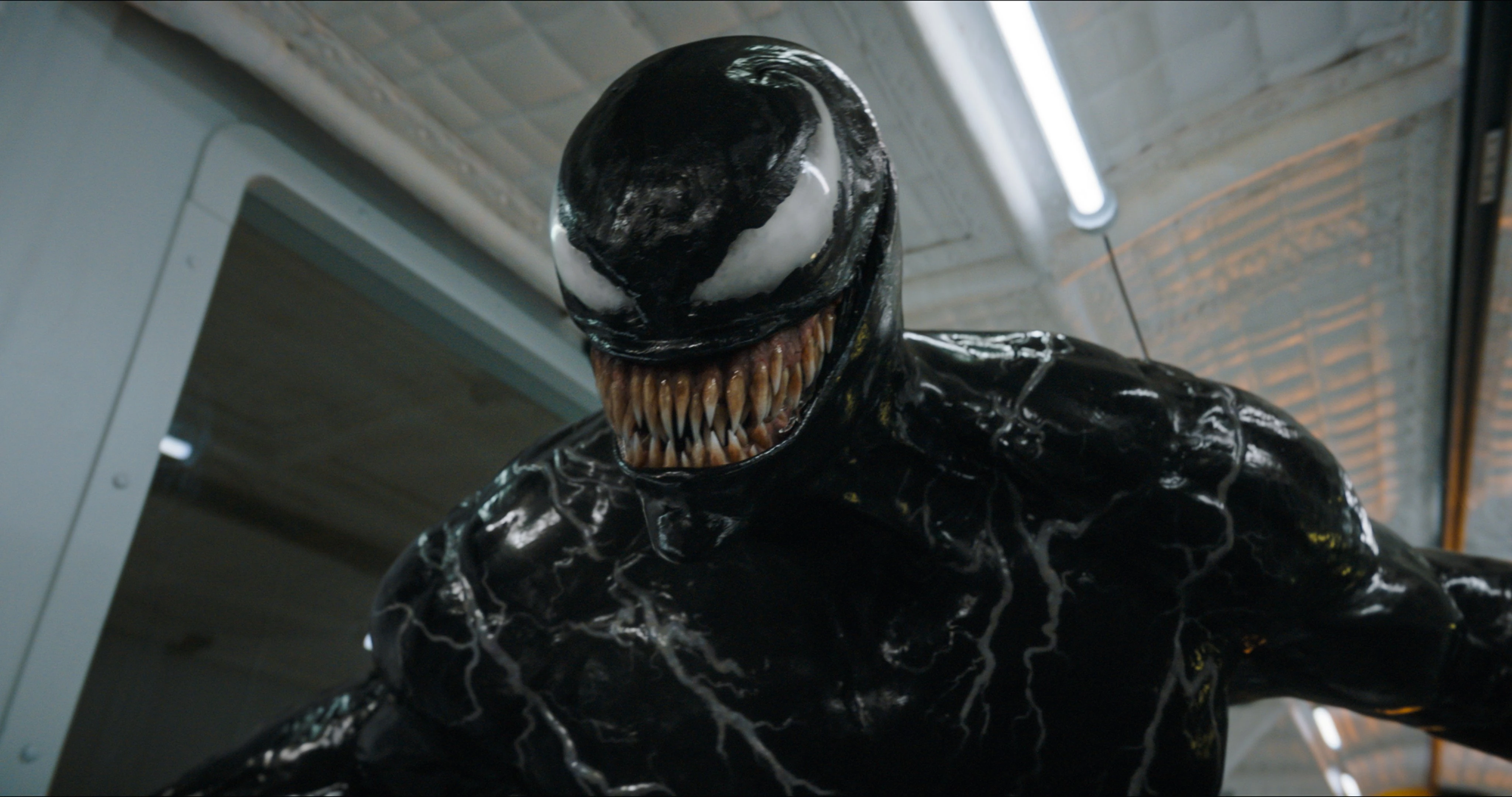 Venom can fully emerge from Brock while remaining attached to him, enveloping the host's body to form its own that akin to a malleable yet resilient sort of combat full-body suit, complete with eyes, claws and extendable, fanged mouth with a long, prehensile tongue. The "suit" uses its razor-sharp teeth and powerful jaws to tear through flesh and bone, allowing it to eat off entire body parts from its victims. Venom's full body-like suit emulates that of its human host's humanoid appearance, resulting in it having a humanoid shape despite it's more monstrous traits. In this form, Venom's physical superhuman attributes are at their peak, amplifying his strength, durability, speed, agility and reflexes far beyond that of normal humans' capacity, which its host can use at full effect. Venom can use its large, fanged maw to tear flesh and bone and absorb the symbiote that was spawned.
